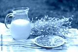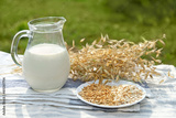 milk in glass jug, oat flakes and ripe oats ears on table in garden. Vegan oat milk, non dairy alternative milk in glass jug. concept of Milk substitute, healthy vegetarian diet.