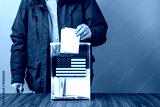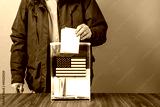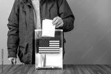 A voter casts a ballot into a ballot box on election day, USA flag