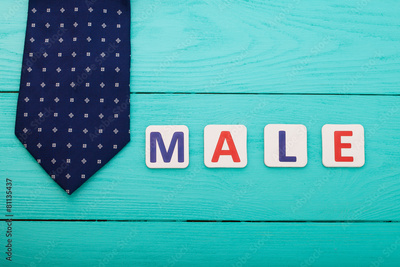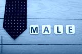 Word male and tie on blue wooden backgrounnd