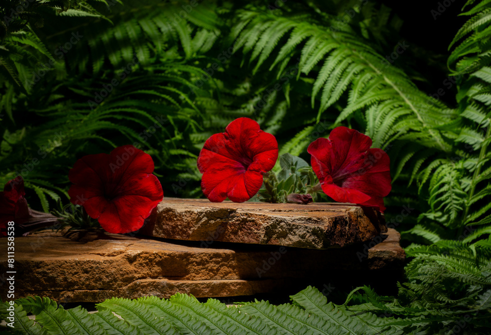 stones and red flowers for the podium