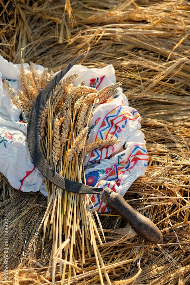 ears wheat and old sickle on field, natural rustic background. Wheat field harvest and ripe wheat straws. harvesting and agriculture concept. top view