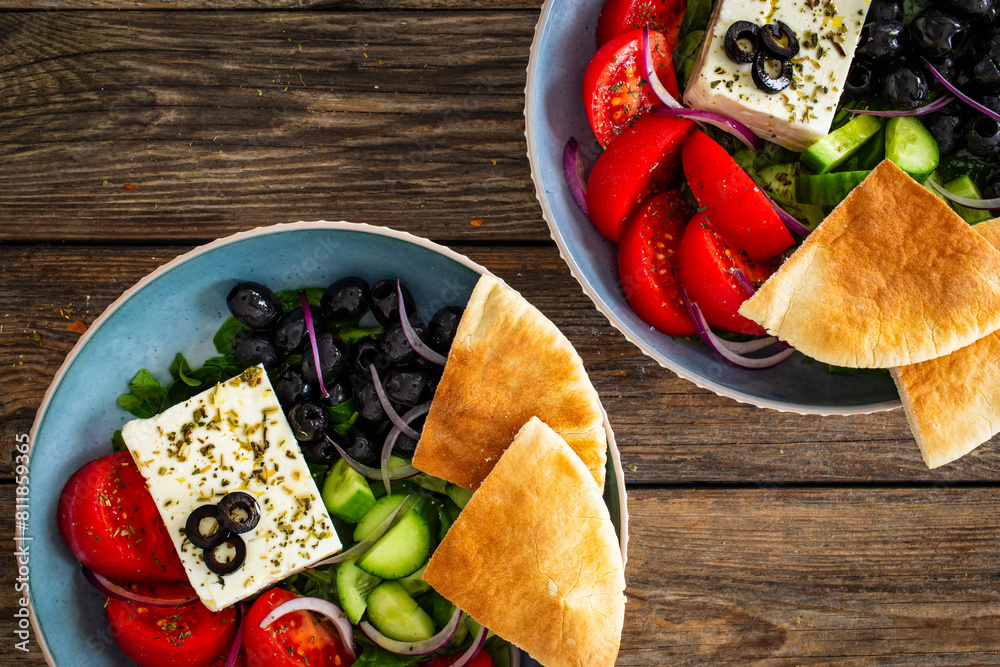 Greek style salad - fresh vegetables with feta cheese, pita bread and black olives served in bowl on wooden table