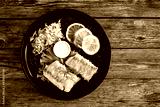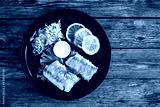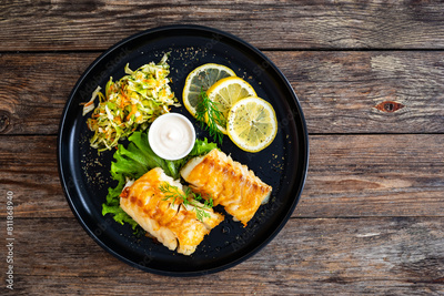 Fried codfish loin served with cabbage salad and lemon slices on black plate on wooden table
