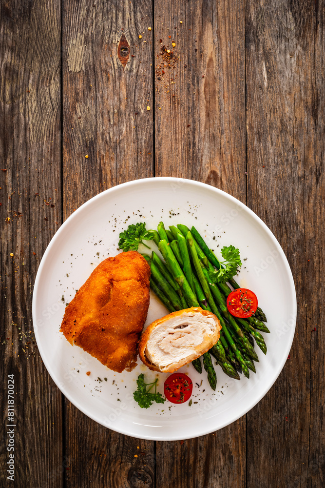 Cutlet de Volaille, wrapped chicken cutlet served with cooked green asparagus on wooden table