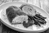 Cutlet de Volaille, wrapped chicken cutlet served with cooked green asparagus on wooden table