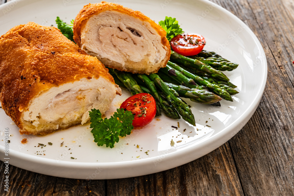 Cutlet de Volaille, wrapped chicken cutlet served with cooked green asparagus on wooden table