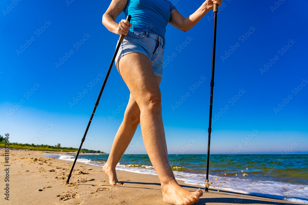 Nordic walking - mid-adult beautiful woman exercising on beach using Nordic walking poles