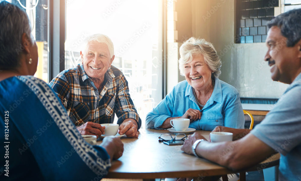 Senior, people and group relax on holiday at cafe on vacation in retirement. Elderly, friends and talk at coffee shop with latte, espresso and drink cappuccino and chat in city morning with tea