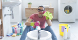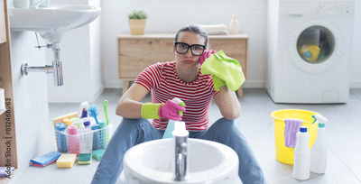 Bored housewife cleaning the bathroom