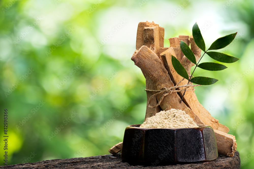 Dried eurycoma longifolia Jack roots ,powder and branch green leaves on natural background.