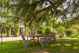 Outdoor lounge corner with wooden table and chairs surrounded by vegetation in Loire Valley in France