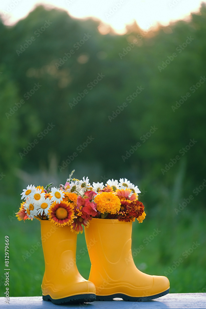 Yellow rubber boots with bright flowers in garden, natural abstract background. summer season. rustic composition with seasonal flowers.