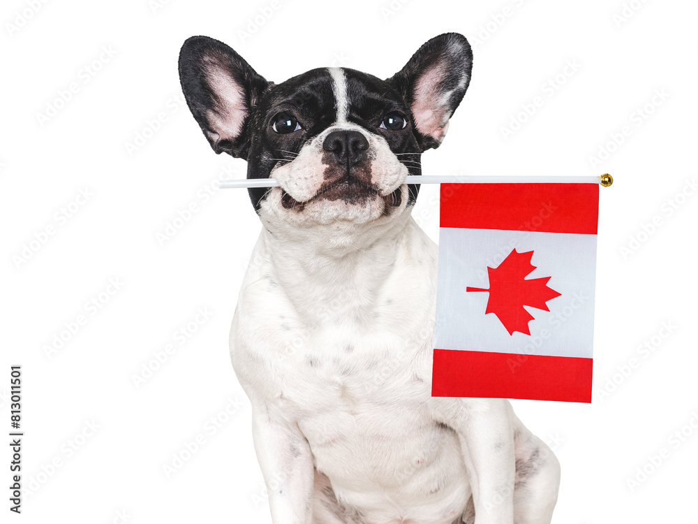 Lovable, pretty puppy and Canadian Flag. Travel preparation and planning. Closeup, indoors. Studio shot, isolated background. Vacation, travel and tourism concept. Pets care