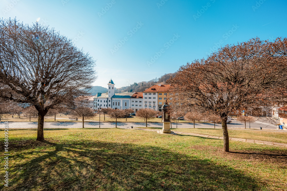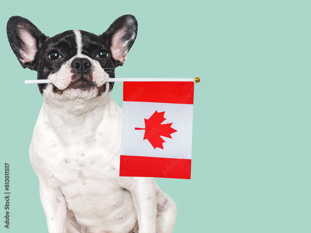 Lovable, pretty puppy and Canadian Flag. Travel preparation and planning. Closeup, indoors. Studio shot, isolated background. Vacation, travel and tourism concept. Pets care