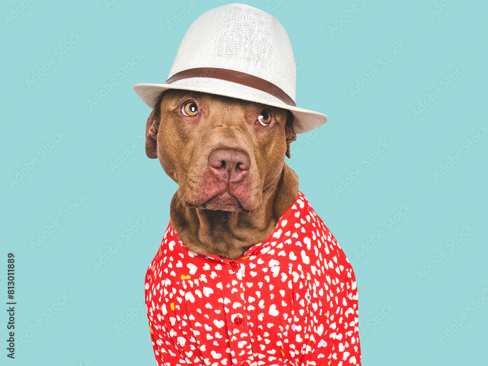 Cute dog, red shirt and sunhat. Isolated background. Close-up, indoors. Studio shot. Day light. Concept of care, education, obedience training and raising pets