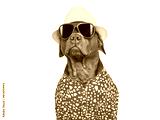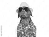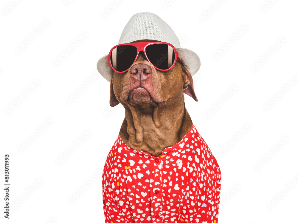 Cute dog, red shirt, sun hat and sunglasses. Isolated background. Close-up, indoors. Studio shot. Day light. Concept of care, education, obedience training and raising pets