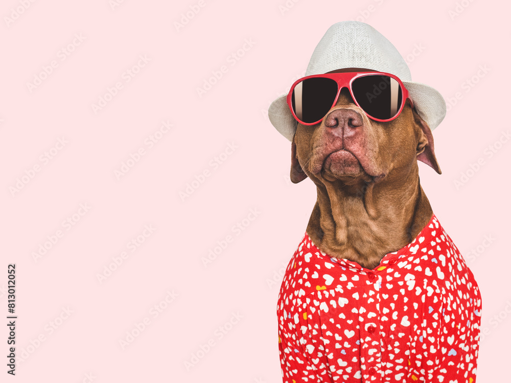 Cute dog, red shirt, sun hat and sunglasses. Isolated background. Close-up, indoors. Studio shot. Day light. Concept of care, education, obedience training and raising pets