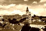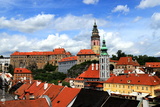 Panorama of Cesky Krumlov, Czech Republic. Red roofs and old medieval houses, water of Vltava River. A beautiful Czech city. View from drone, Krumlov