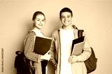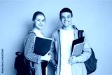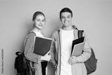 Two happy teenagers are standing side by side against a vibrant yellow backdrop, carrying backpacks and holding books