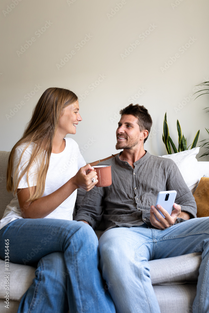Vertical portrait of happy couple enjoying morning time together drinking coffee and relaxing sitting on the couch.
