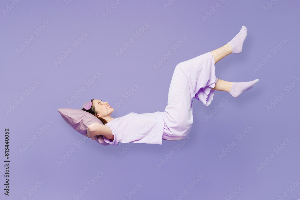 Full body side view young fun calm woman she wear pyjamas jam sleep eye mask rest relax at home fly up hover over air fall down isolated on plain pastel purple background. Good mood night nap concept.