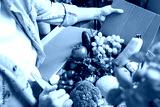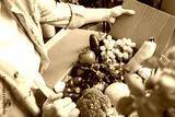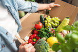 Healthy organic farm grown vegetables and fruits in a delivery cardboard high angle view.