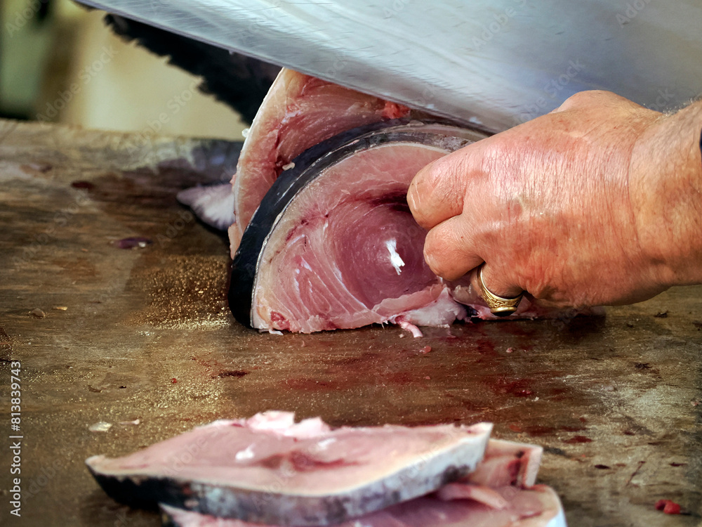 detail of hand of a fishmonger chopping swordgish at fresh fish seafood at Ortigia Syracuse sicily fish market Italy