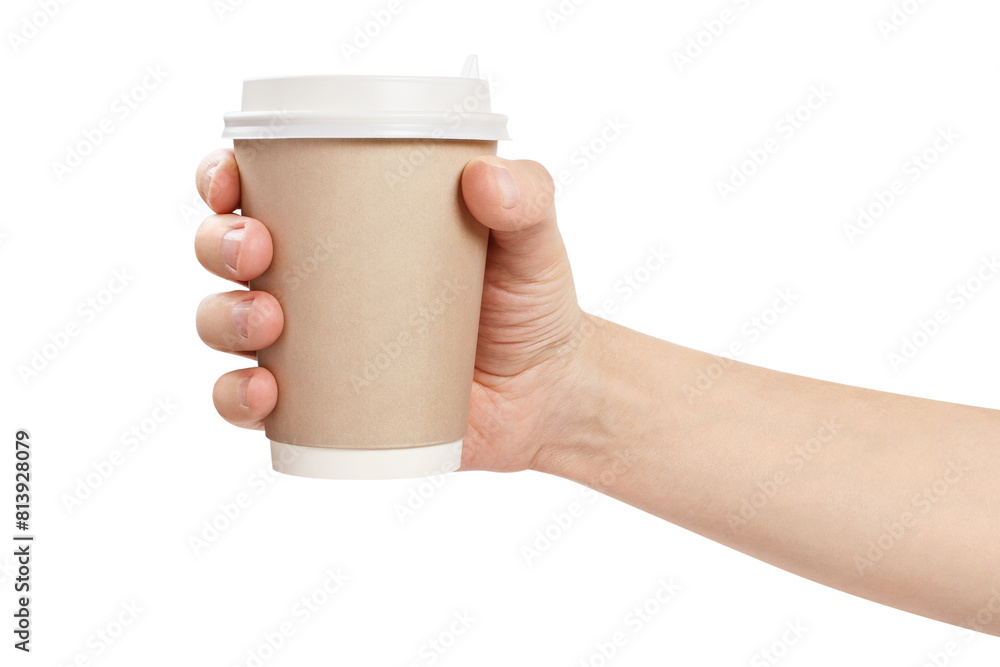 Disposable coffee cup in male hand, cut out