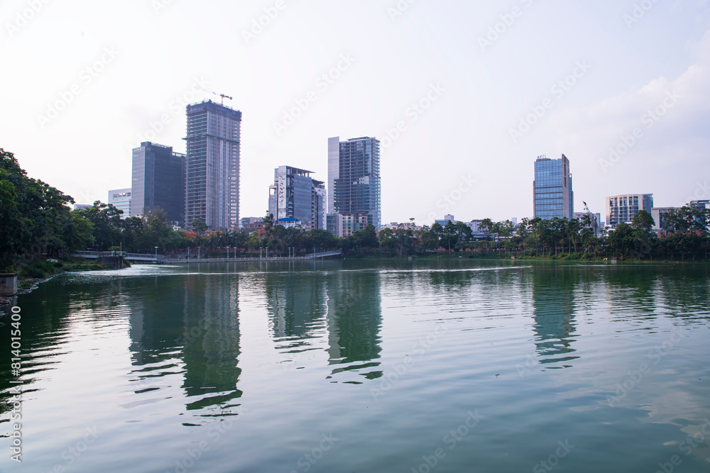 Beautiful Skylark landscape view of Hatirjheel lake with blue sky in Dhaka-Bangladdesh