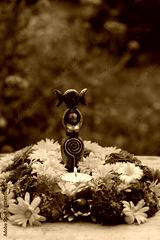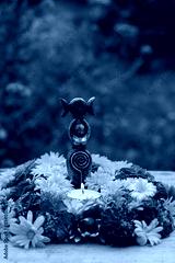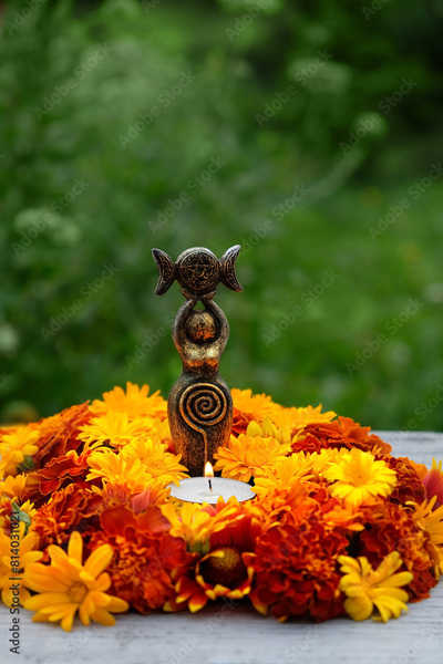 Triple Goddess figurine with candle and colorful flowers in garden, nature background. Symbol of the Triune Moon. esoteric ritual for Litha, Midsummer. witchcraft, wiccan spiritual practice.