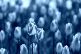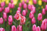 Pink white tulip flowers, spring background. Field of blooming tulips, selective focus