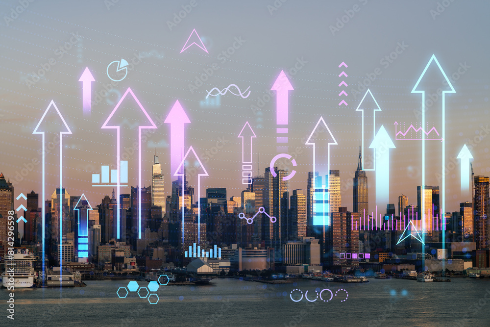 New York cityscape at dusk with futuristic holographic overlays of graphs and symbols. Double exposure