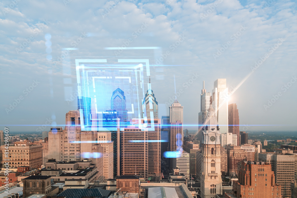 Philadelphia skyline with a digital hologram overlay, cityscape background, and light flare. Double exposure