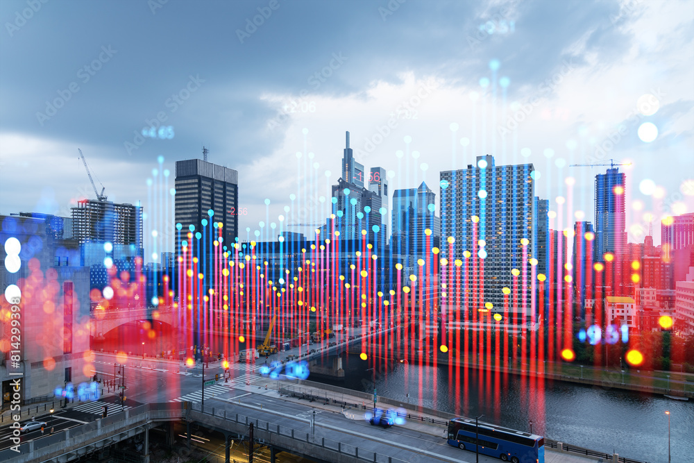 Philadelphia skyline with holographic data points and graphs overlay, photographed at twilight. Double exposure