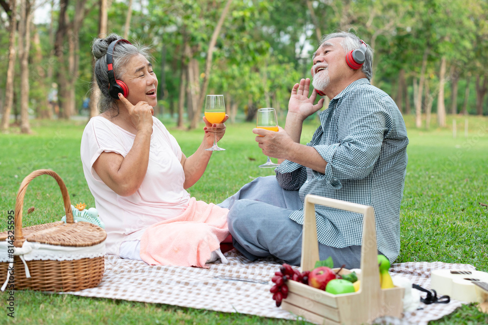 senior couple have a picnic wearing headphone to listen a music and holding orange juice glass in the park