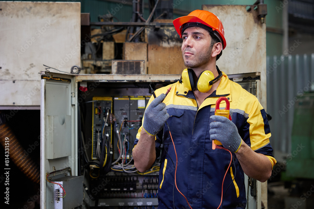 portrait engineer or technician operating and fixing industrial control panel in the factory