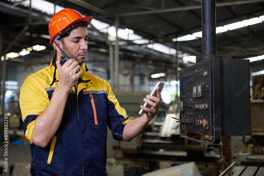 engineer or technician talking on walkie talkie and working with tablet for checking lathe machine in factory
