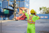back view worker or engineer using walkie talkie and showing gesture to crane car in containers warehouse storage