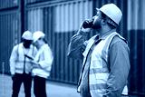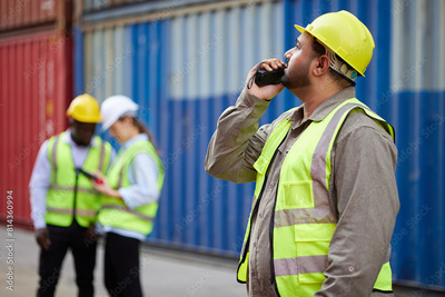 worker or engineer using walkie talkie and talking about work in containers warehouse storage