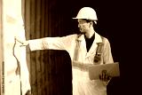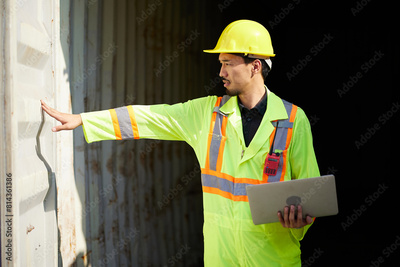 worker or engineer holding laptop computer and checking inside containers warehouse storage