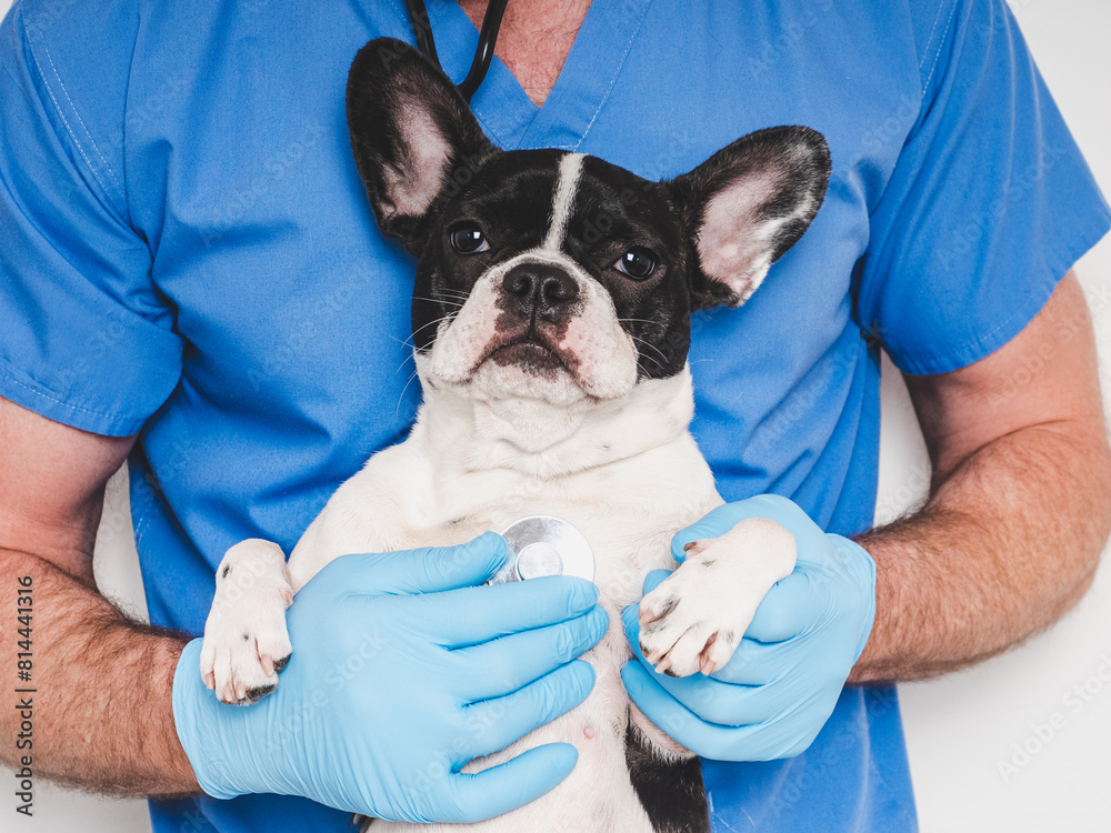 Cute puppy and veterinarian. Closeup, white isolated background. Studio shoot. Concept of care, education, training and raising of animals