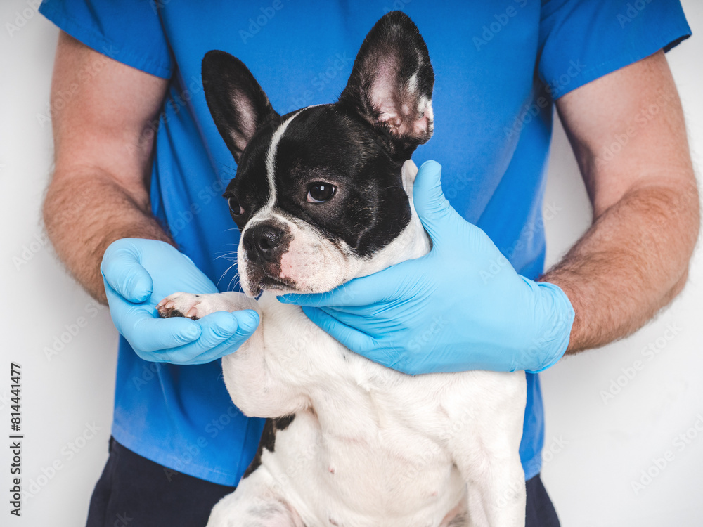 Cute puppy and veterinarian. Closeup, white isolated background. Studio shoot. Concept of care, education, training and raising of animals