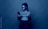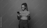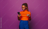 Happy gen z woman smiling and paying online with credit card on vibrant purple background