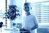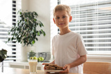 Boy holding a plate of homemade chocolate chip cookies, with a glass of milk on the table