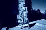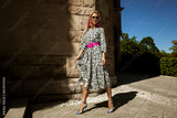 Elegant, stylish woman in feminine floral dress and sexy high heels is sensually walking in the city on a sunny summer day. Outdoor shoot
