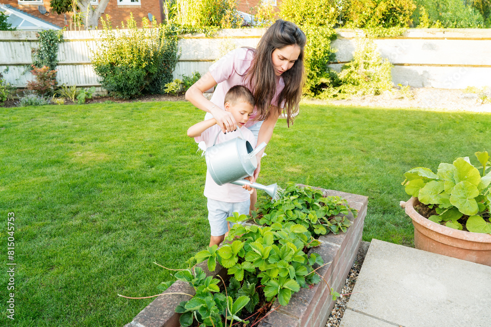 Mother and son watering vegetables in pots garden in Backyard on Sunny Summer Day. Boy helps mom take care of kitchen garden, woman teaches son to take care of plants. Time together. Active childhood