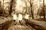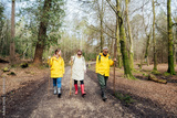 Group of friends walking with backpacks in forest. Trekking travel in adventure lifestyle, nature hiking in vacation holiday with journey. Tourism, hiking, and friendship concept. Outdoor activities.