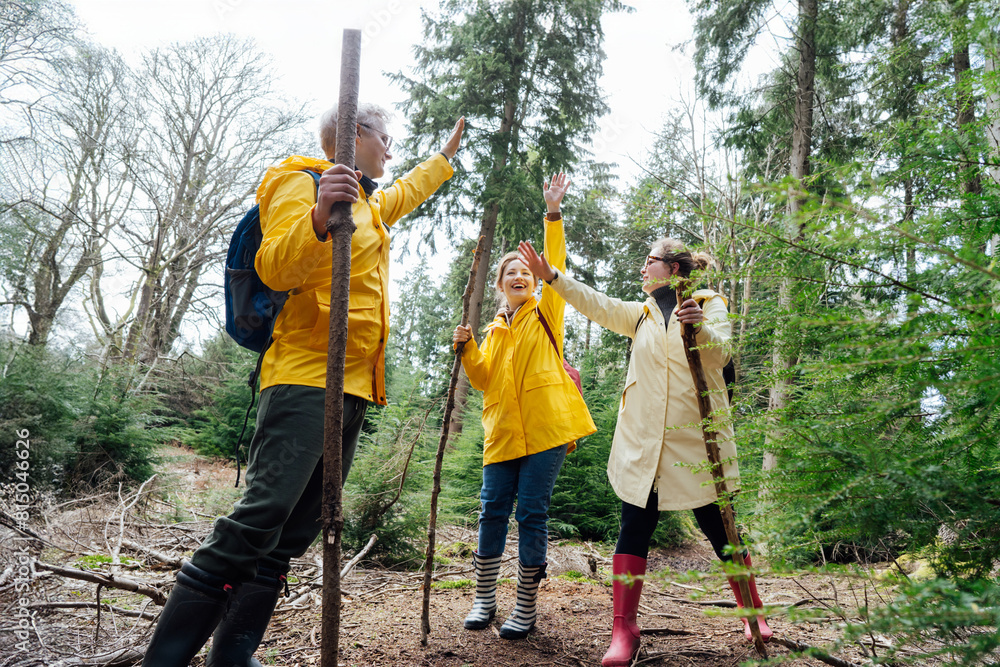 Happy friends giving high five after completing hiking trek in forest. Teamwork. Travel in adventure lifestyle, nature hiking in vacation holiday with journey. Tourism, hiking, and friendship concept.