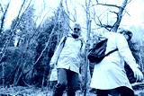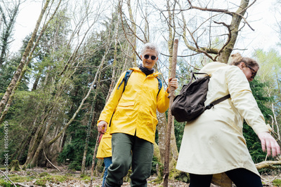 Group of friends walking with backpacks in forest. Trekking travel in adventure lifestyle, nature hiking in vacation holiday with journey. Tourism, hiking, and friendship concept. Outdoor activities.