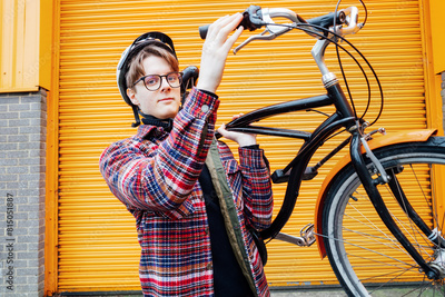 Young male student in eyeglasses and protective helmet carries on his shoulder orange bike against the wall. Eco friendly transportation for carbon footprint. Sustainable lifestyle.